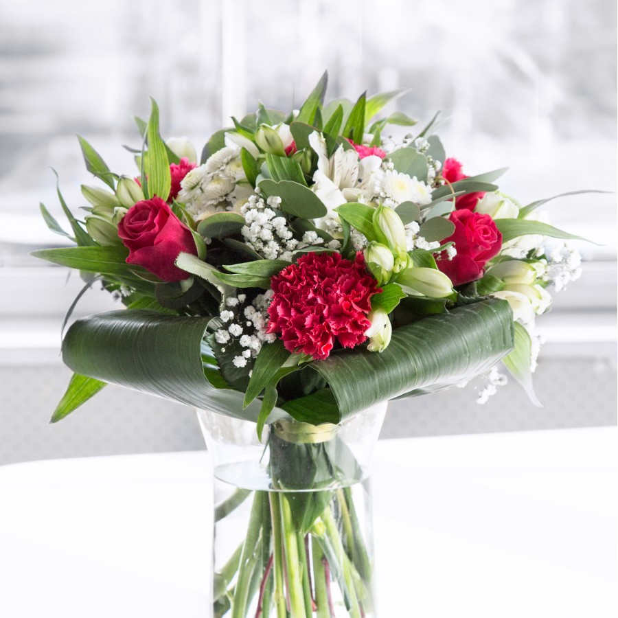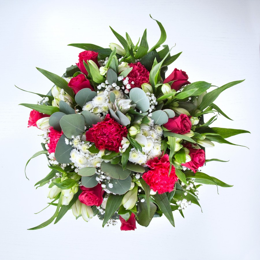 Our Timeless Beauty Bouquet captures the essence of elegance with its blend of vibrant red roses, carnations, and sweet white chrysanthemums, enhanced by delicate gypsophila. Combined with white alstroemeria and aspidistra leaves, this arrangement offers a unique and captivating design.